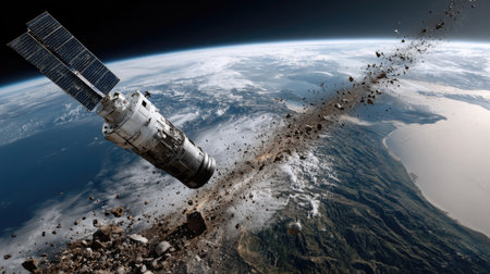 This captivating image captures the phenomenon of space debris floating in orbit, with Earth visible in the background. The scene illustrates the challenges of space exploration and the importance of safeguarding against orbital debris.