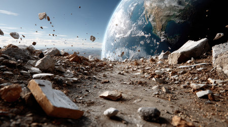 This striking image depicts Earth in the foreground, surrounded by debris and rocks floating in space. The dark background enhances the beauty of the planet, creating a vivid and realistic scene that evokes thoughts of space exploration and cosmic phenomena.