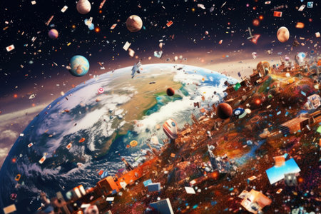 A stunning view of Earth surrounded by debris in orbit, highlighting environmental issues and the impact of pollution on our planet. This cosmic scene encourages awareness of climate change.