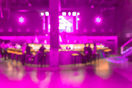 Blurred modern abstract interior of a nightclub with neon purple lighting on the walls.