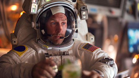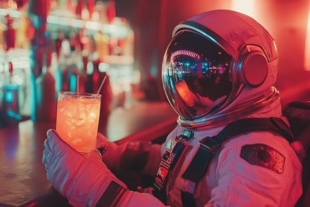 Astronaut in space suit and helmet holding a cocktail in a nightclub.