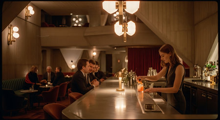 A bartender serves drinks to men sitting at a dimly lit bar