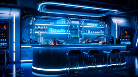 Cyberpunk Cocktail Bar with Interactive AI Bartender - Textured black steel floors, illuminated geometric bar counter, AI-powered mixology station, neon