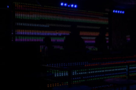 silhouette dj mixing audio music at night club. male sound engineer balancing volume of digital mixer at pub. blur defocused background