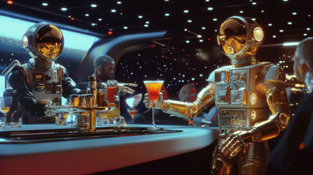 Two shiny golden astronauts serve cocktails in a vibrant space bar filled with glowing lights and patrons, creating an exciting nightlife atmosphere in the cosmos.
