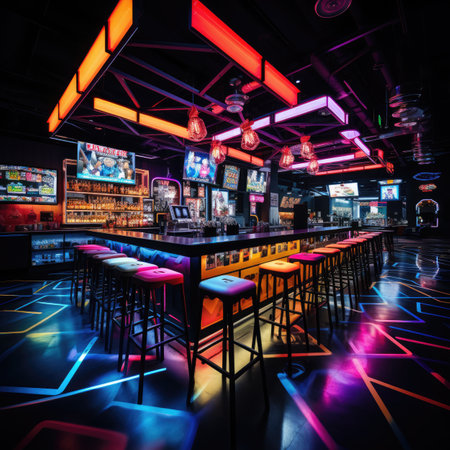 The interior of a night club with neon lights.