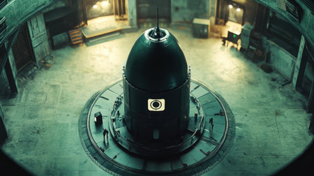 A captivating view of a futuristic dome structure in an abandoned industrial space. The scene is illuminated by mysterious lighting, creating an eerie ambiance while people observe from various angles.
