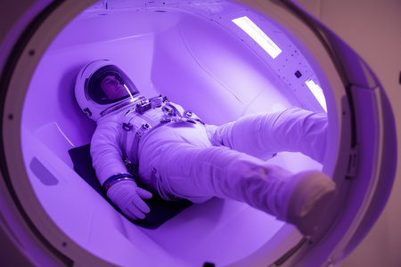 An astronaut is training floating in a zero-gravity simulator in a large pool to simulate weightlessness for future space missions and operations. Generative AI