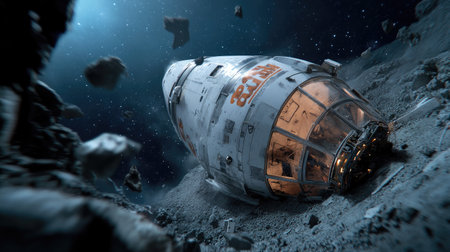 Abandoned spacecraft wreckage drifting through deep space, surrounded by metallic debris.