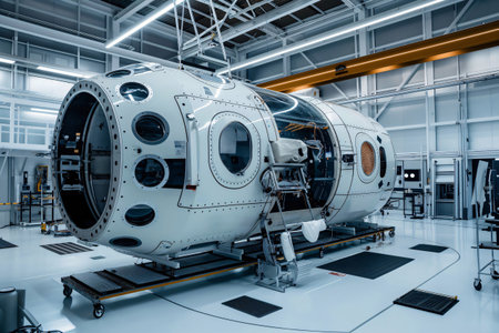 Large, white, futuristic looking spacecraft module being assembled in a factory