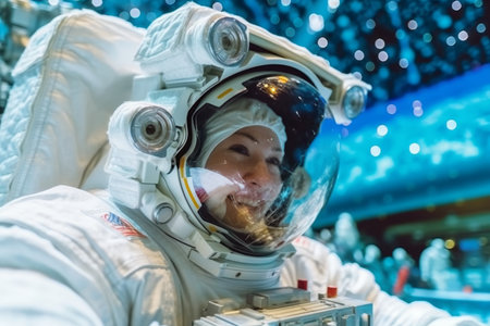 Portrait of astronaut floating in space. Front view on spacesuit technology. Generative AI.