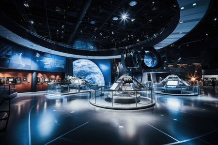 A stunning replica of a spaceship hangs from the ceiling adding to the futuristic and educational atmosphere