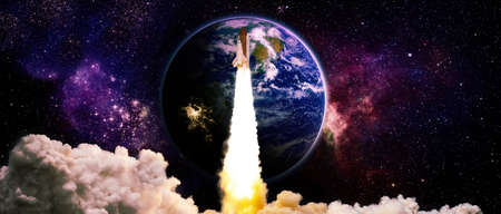 Rockets launch into space on the starry sky. spacecraft flies into space with clouds of smoke. Elements of this image