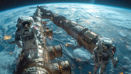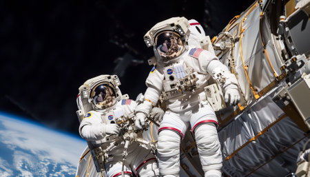 astronauts working diligently to repair and maintain the International Space Station (ISS). They are performing tasks outside the station,Generated with AI