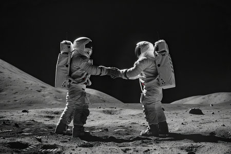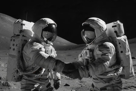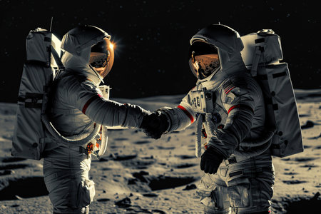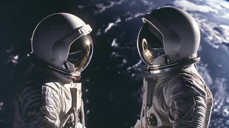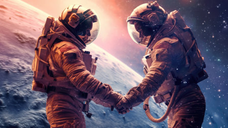 Generative AI : Astronauts in spacesuits work in outer space near to spaceship Spacemans isolated on black background Elements of this image furnished by NASA