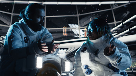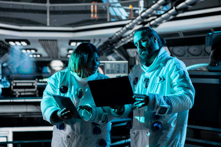 Teamworking astronauts doing brainstorming to confirm suit integrity using laptop. Orbital station colleagues talking, testing gear during routine equipment check using notebook