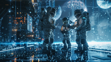 Group of astronauts in spacesuits seating in cockpit of space shuttle. Flying on spaceship during lunar expedition