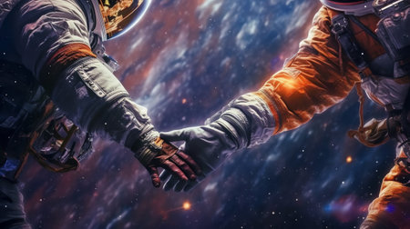 Astronaut couple holding each others hands on space sky background, imagination of love passion fantasy. Generative AI image weber.