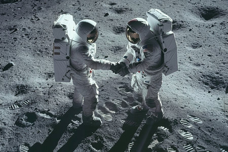 Two astronauts are collaborating on a mission. Conducting research and exploration on an alien planet. With a large moon dominating the sky. Showcasing the wonders and challenges of space exploration