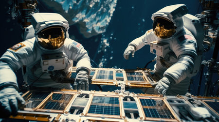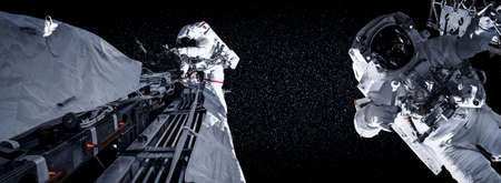 Two astronauts are engaged in experiences and repair at the space station, in an outer space