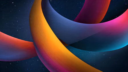 Vibrant abstract background featuring intertwined 3D shapes in orange, blue, and pink against a dark, starry backdrop.