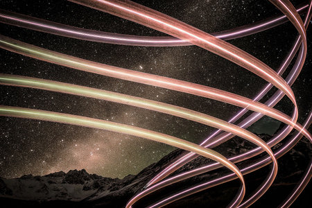 Bright and colorful light trails create a dynamic and abstract scene, showcasing vibrant energy and motion effects in long exposure photography.