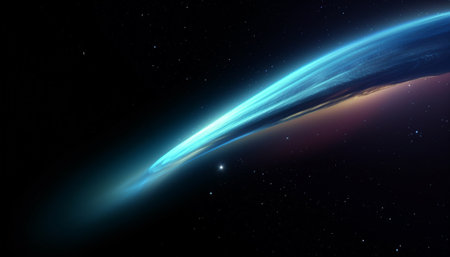 This digital artwork presents flowing lines against a dark backdrop, suggestive of cosmic energy. The composition features cool blues and hints of golden light, evoking a sense of depth and movement. It could be used for various projects, including editorial features or visual designs.