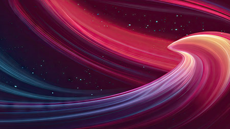 Dynamic composition featuring flowing, curved lines in shades of red, purple, and blue, creating a sense of movement. The artwork is characterized by smooth textures and gradients against a dark backdrop. Suitable for various design projects, it can be used for advertising, digital art, and website design elements.