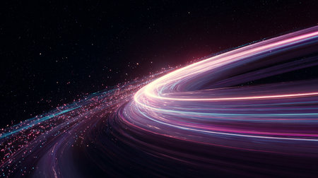 Abstract swirling tunnel of vibrant magenta and blue light streaks with tiny sparkling dots