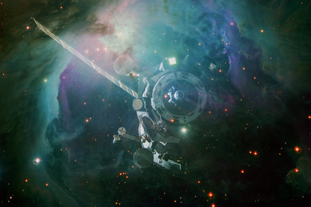 Spacecraft. Cosmic art, science fiction wallpaper. Beauty of deep space. Billions of galaxies in the universe.