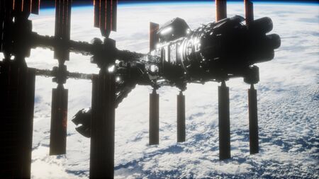 spectacular panorama of the sun-kissed space station seen from a space probe revolving around the planet. elements furnished by NASA