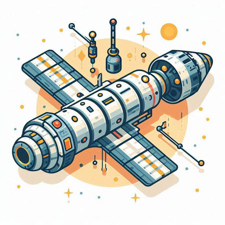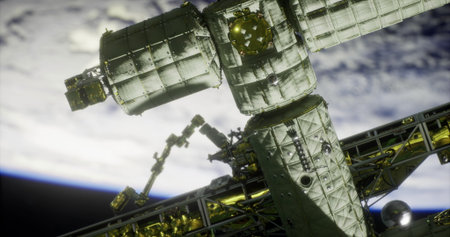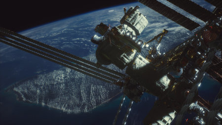A detailed view of a space station in low Earth orbit, showcasing the intricate structures and equipment against the backdrop of Earth. The vastness of space contrasts with the technology.