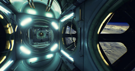 Inside a modern space station, bright lights illuminate a circular corridor. Windows reveal a stunning view of Earth, showcasing its curves and colors against the vastness of space.