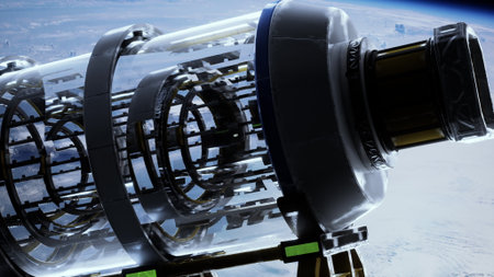 cutting-edge laboratory made of metal and glass, like a spaceship, spinning around Earths orbit. elements furnished by