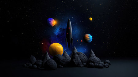 A sleek rocket ascends towards the cosmos, surrounded by vibrant planets and rocky asteroids. The dark background sparkles with distant stars, emphasizing the wonders of space.