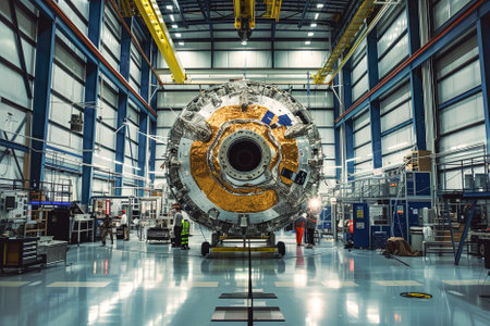 Satellite production: In high-tech facility factory, engineers craft a sophisticated satellite, integrating advanced technologies.
