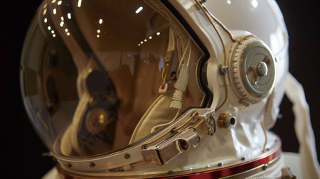 An intricately designed space helmet equipped with a builtin neutrino communication device that allows astronauts to communicate while on spacewalks