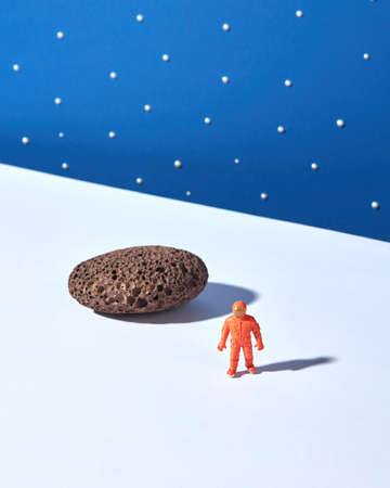 Toy plastic astronaut on a light ground with stone and shadows against blue starry sky background. Place for text. Outer space concept.