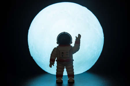 Space travel concept, toy astronaut on dark background