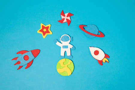 planet, astronaut, stars and rocket on deep blue background, vertical photo, imitation of space. Cosmonautics Day concept. April 12th day of the first human space flight. space shuttle flat lay