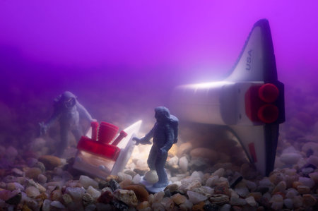 two astronauts figurines walking and discovering a planet