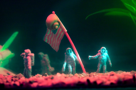 Diorama representing the concept of an American lunar base with an astronaut with his hand in an ok position. Diorama created with different kind of toys.