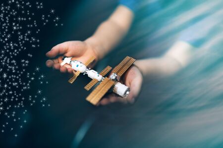 Child boy imagines himself to be an astronaut in an space helmet on black.