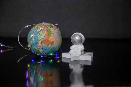 Toy astronaut with globe on a black background