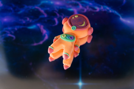 Astronaut in space. Cute cosmonaut made of plasticine against the background of nebulae and space