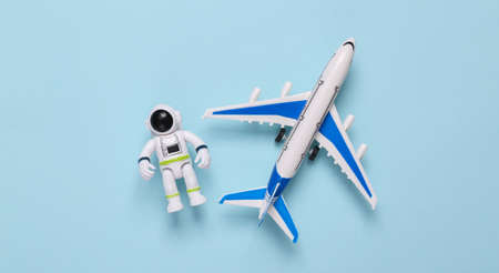 Astronaut toy model with air plane on blue background. space mission