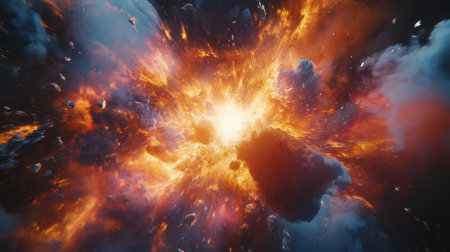 A stunning depiction of an explosive cosmic event lighting up the dark universe, surrounded by fragmented asteroids and vivid celestial bodies, showcasing the beauty and mystery of space.