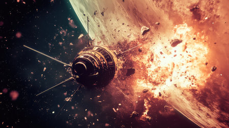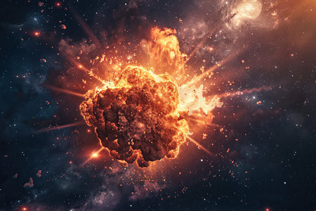 Asteroid explosion in space. A digital art representation of fiery space explosion. Catastrophic event in the cosmos. Meteorite or comet breaks into pieces.