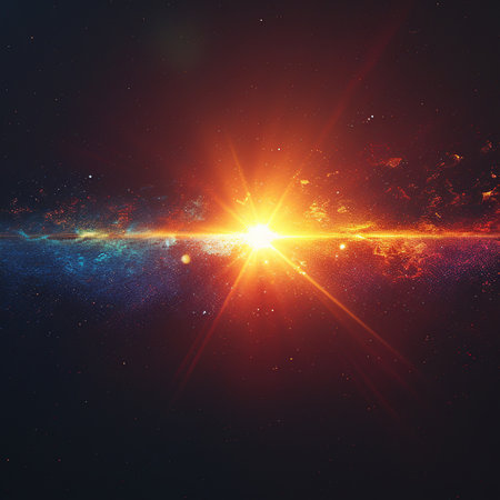 Dynamic Explosion of Orange Light and Blue Sparks Against a Deep Black Cosmic Sky Background