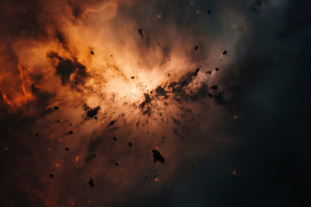 A fiery explosion in space, surrounded by swirling clouds of gas and dust.